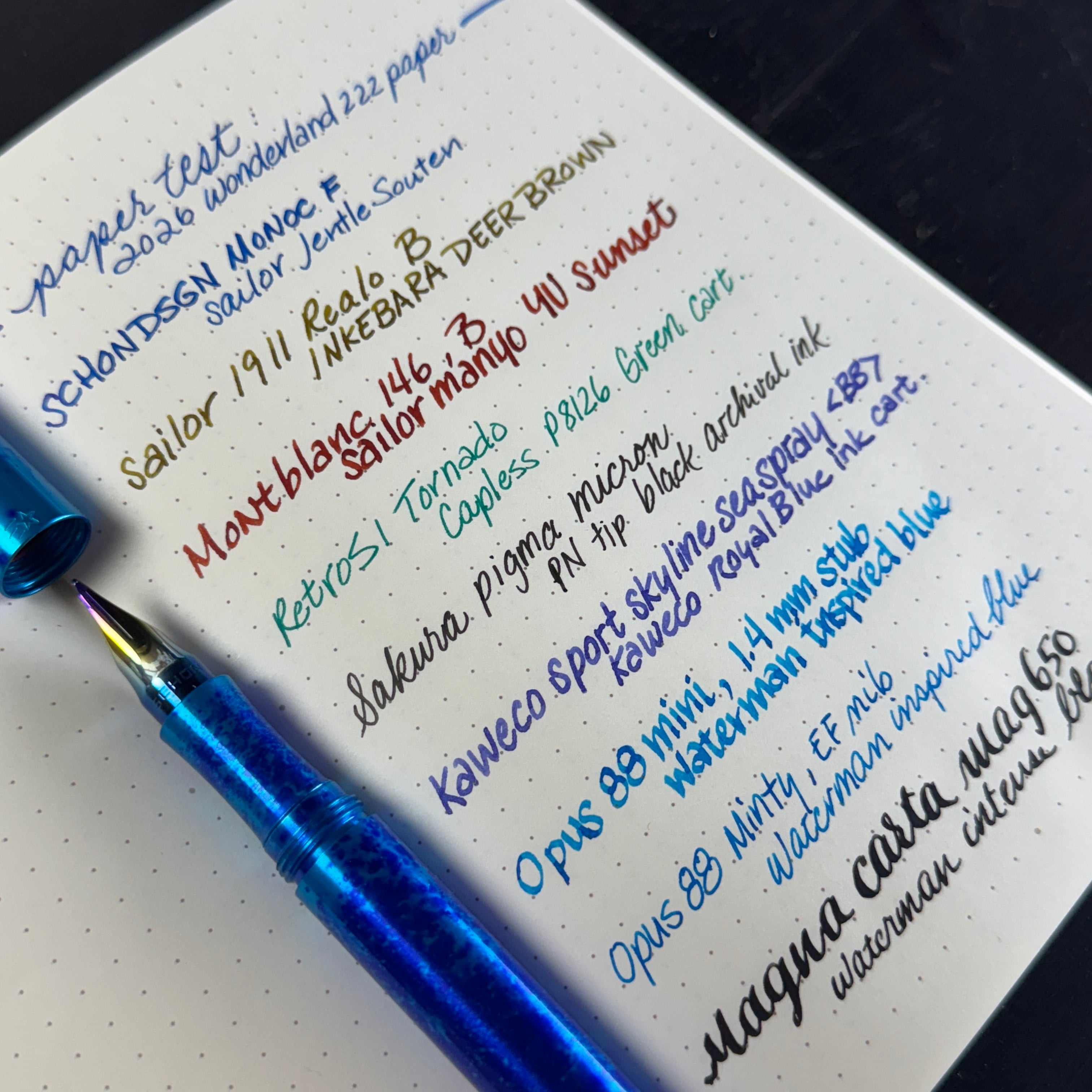 After years of working with the elusive Tomoe River Paper, in 2025, Wonderland222 introduced a new Japanese paper that would be more consistently available over the long run. The results are phenomenal. Thin, 52gsm paper captures each stroke with smoothness and fidelity, showing the depth of the ink color.